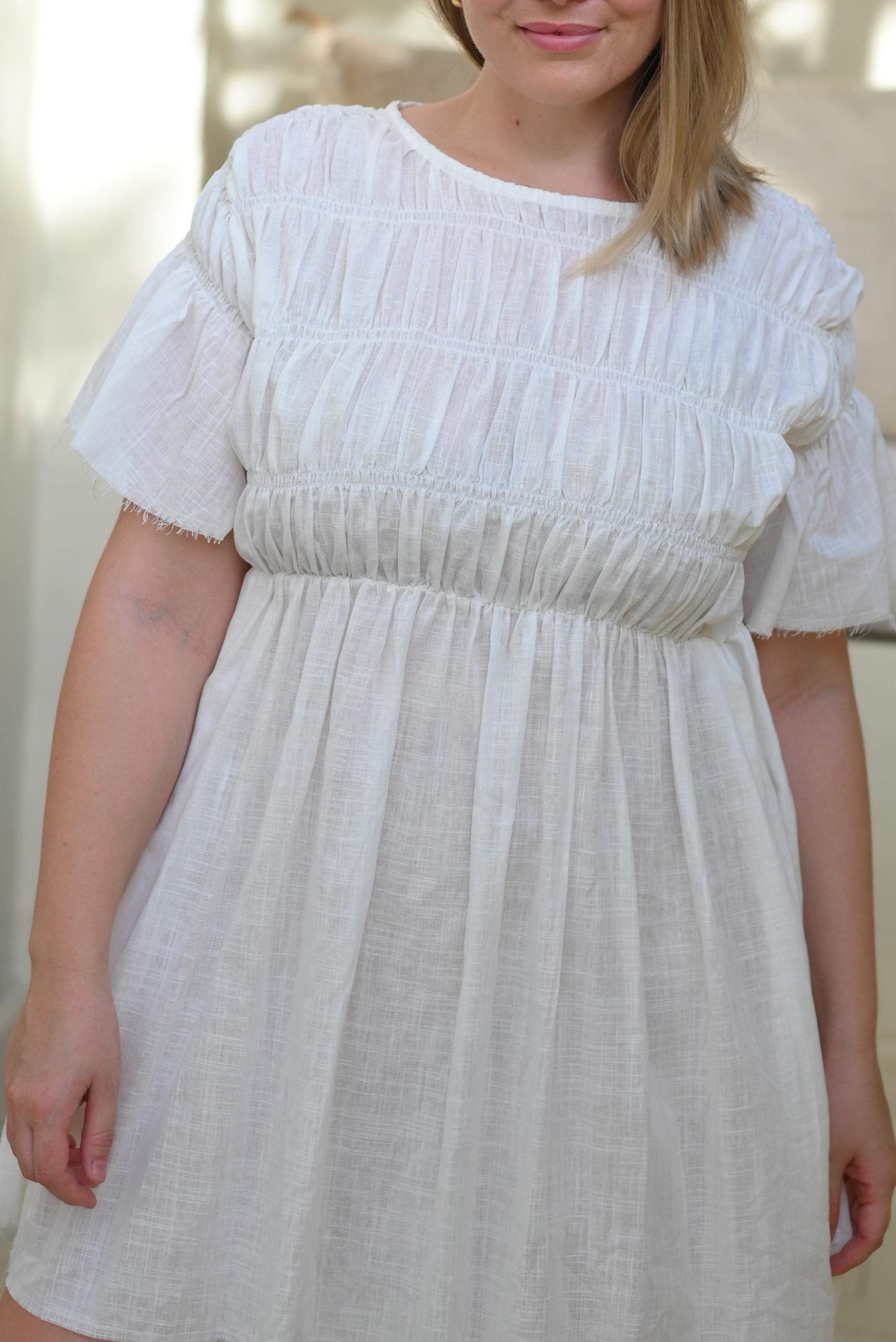 Embrace effortless summer elegance with our White Cotton Babydoll Dress, a timeless piece designed for comfort and style. Featuring a flattering boat neck neckline and delicate flutter sleeves, this dress exudes feminine charm.