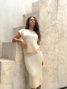 Crafted from a premium cotton-acrylic blend, the Astrid Top provides the perfect balance of softness and resilience. Its breathable knit ensures comfort throughout the day, while the structured finish adds a refined touch. The rich cream shade makes it an ideal neutral, pairing seamlessly with a variety of tones and textures.