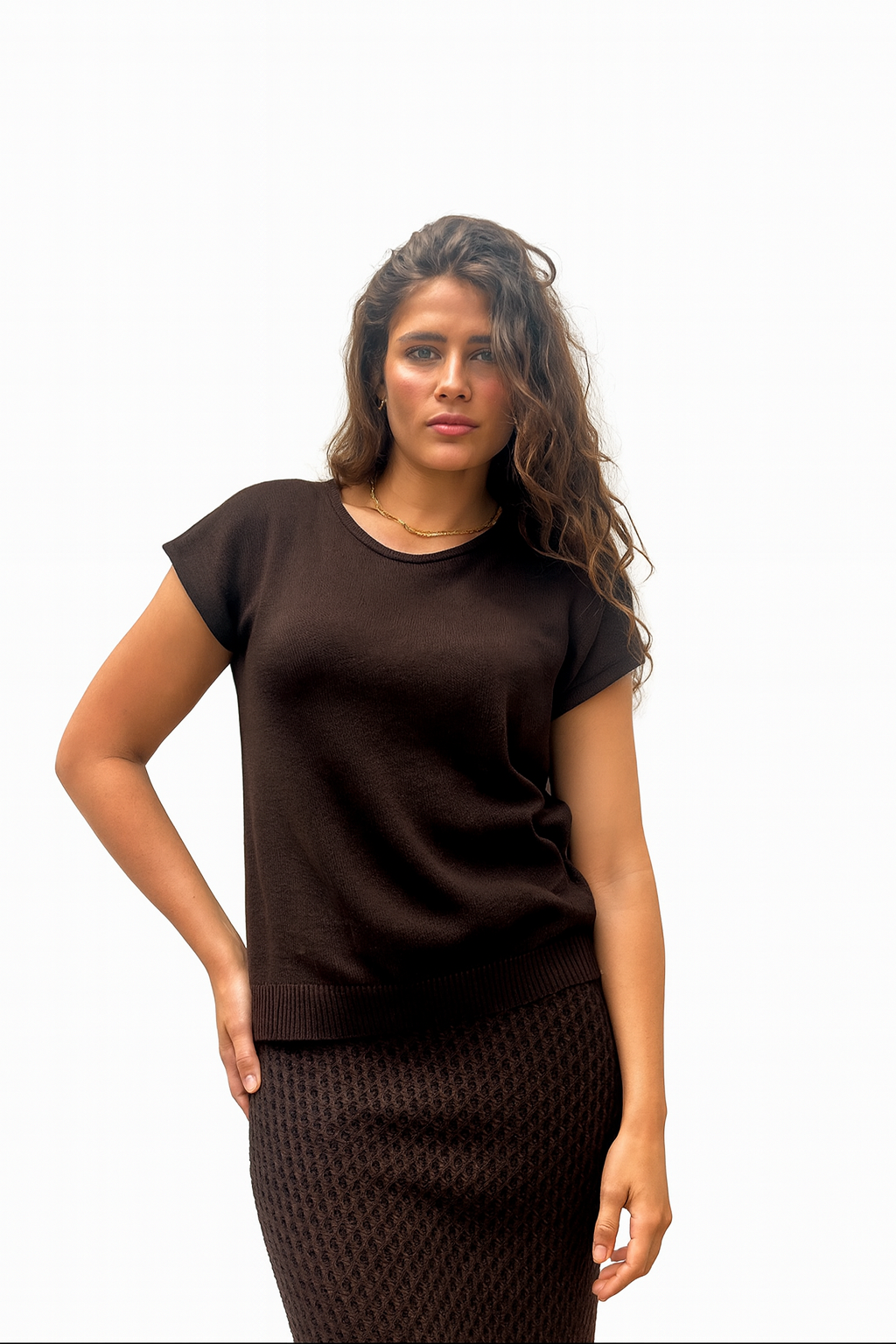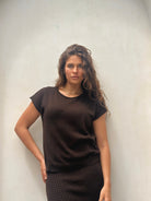 Crafted from a premium cotton-acrylic blend, the Astrid Top provides the perfect balance of softness and resilience. Its breathable knit ensures comfort throughout the day, while the structured finish adds a refined touch. The rich choco shade makes it an ideal neutral, pairing seamlessly with a variety of tones and textures.