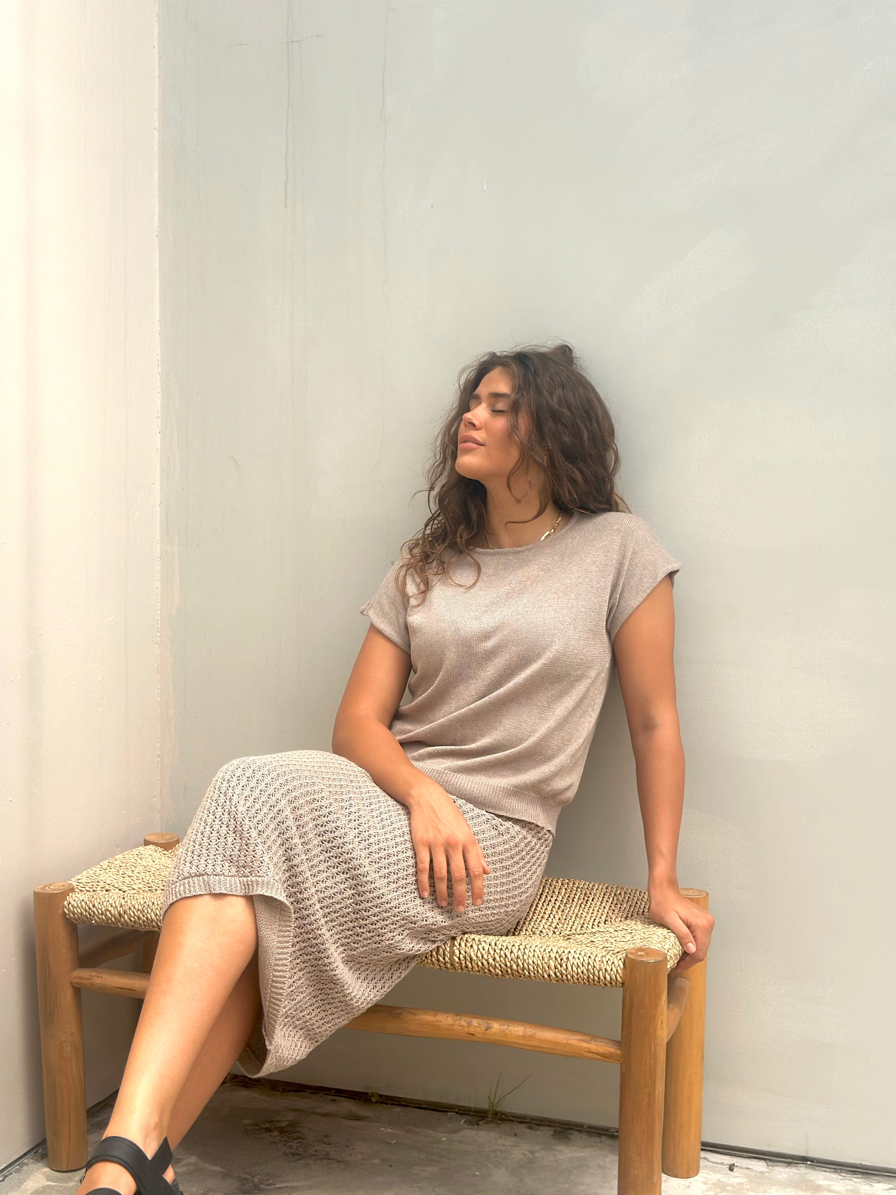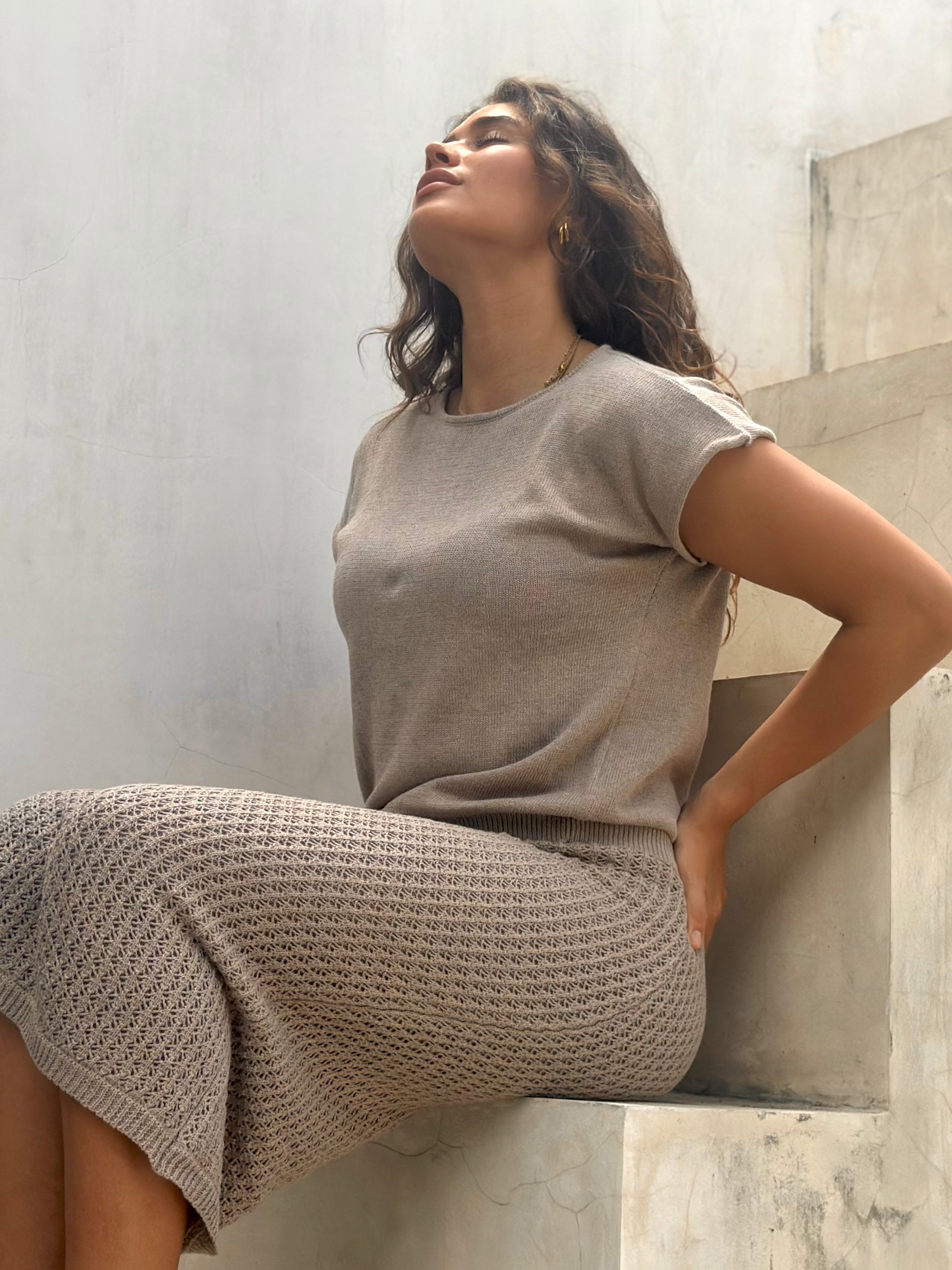 Crafted from a premium cotton-acrylic blend, the Astrid Top provides the perfect balance of softness and resilience. Its breathable knit ensures comfort throughout the day, while the structured finish adds a refined touch. The rich mocha shade makes it an ideal neutral, pairing seamlessly with a variety of tones and textures.