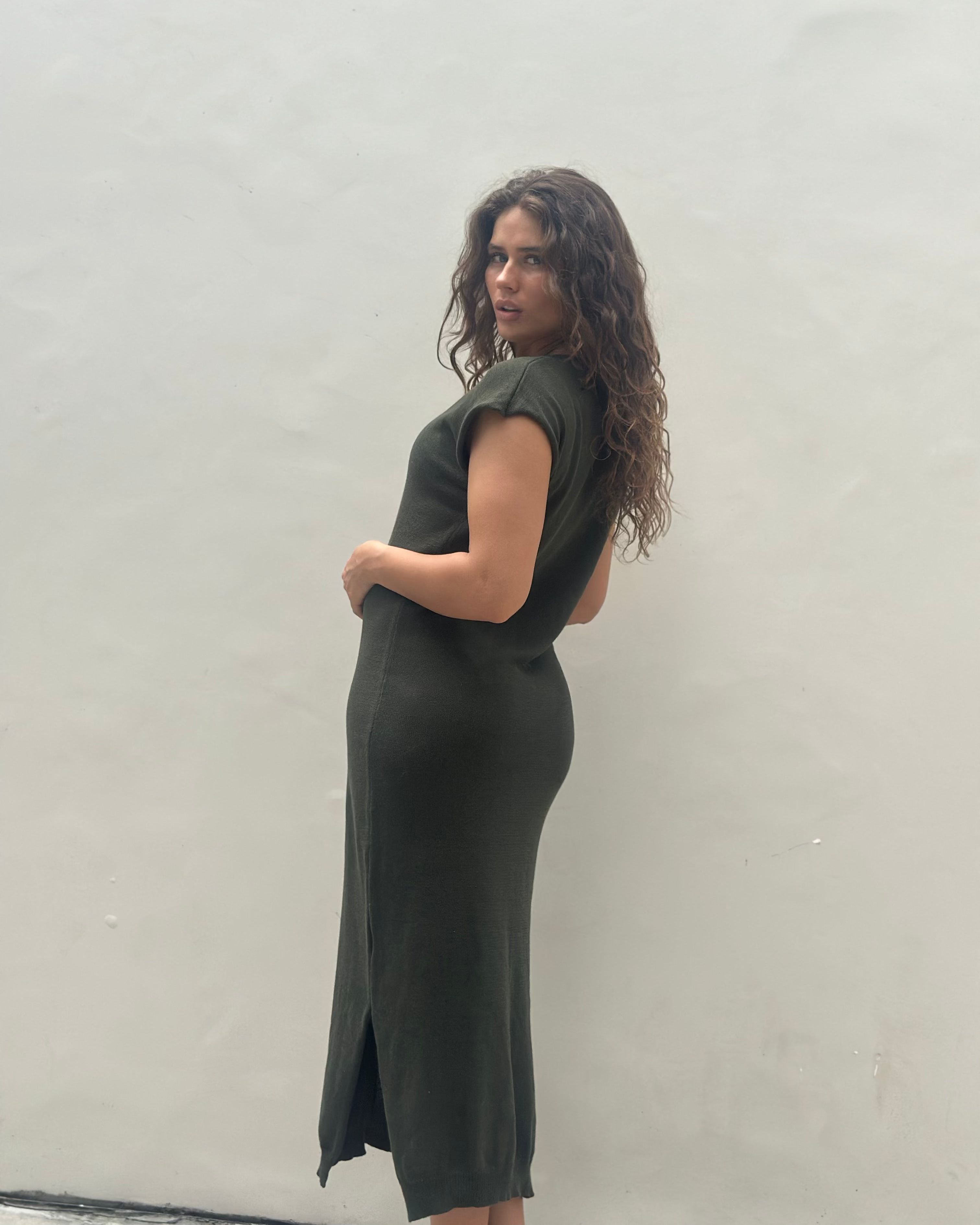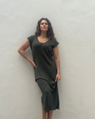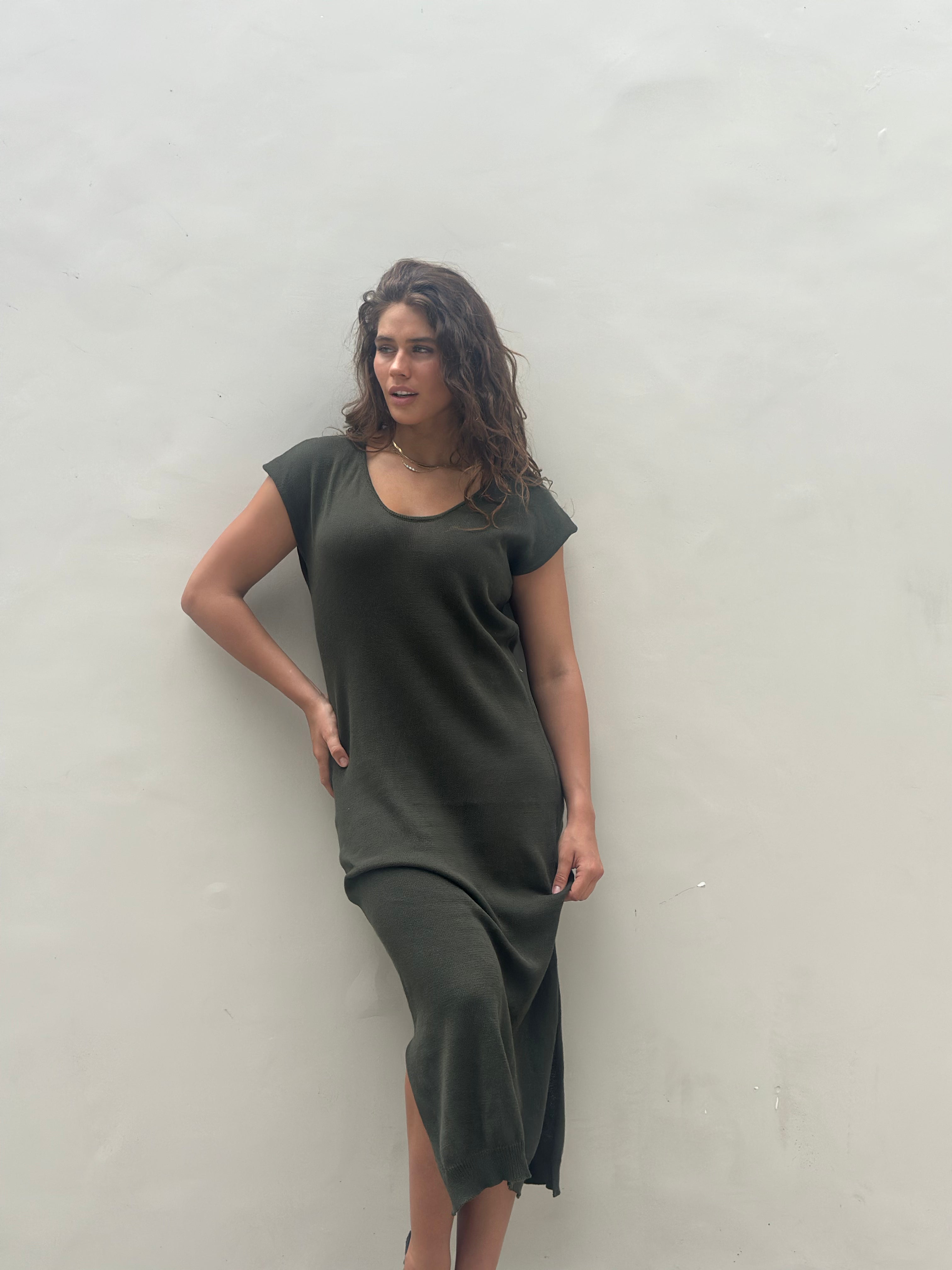 Add the Bea Maxi Knit Khaki Dress to your wardrobe for a timeless cotton essential that blends ease, texture, and sophistication.