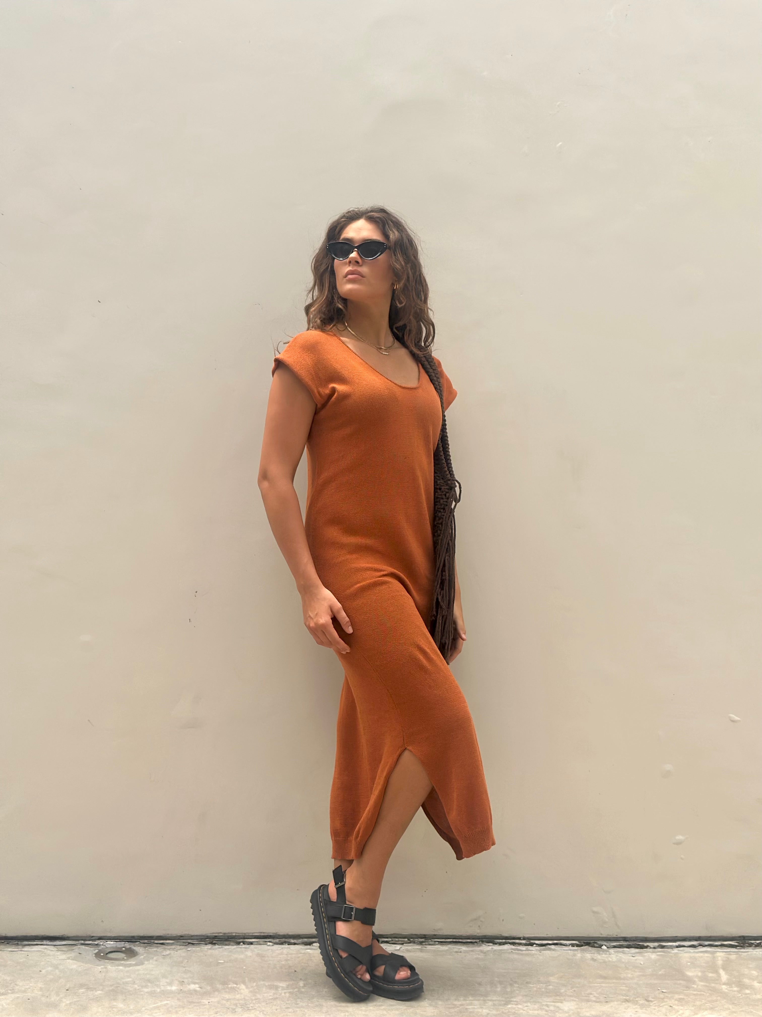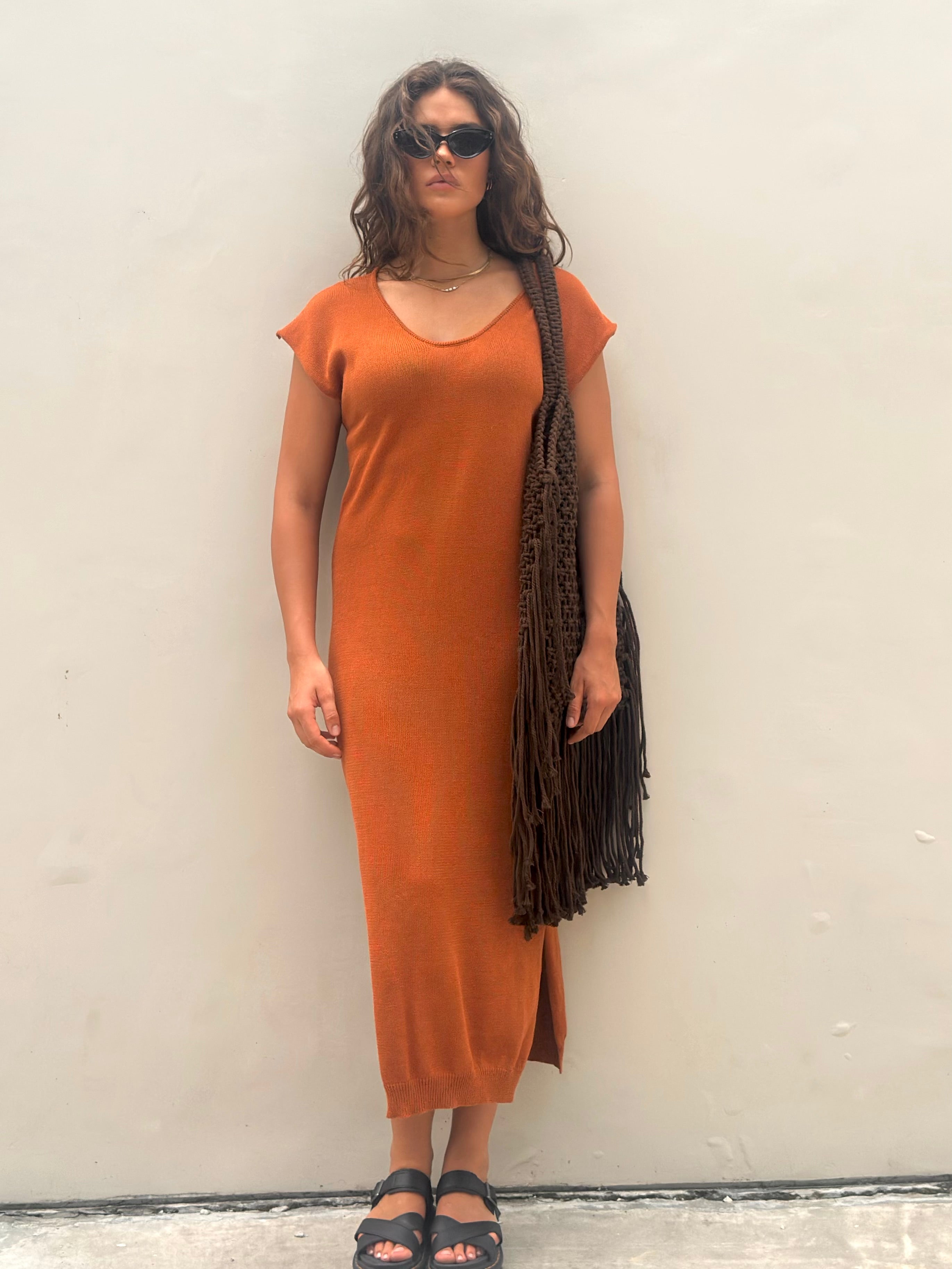 Add the Bea Maxi Knit Rust Dress to your wardrobe for a timeless cotton essential that blends ease, texture, and sophistication.