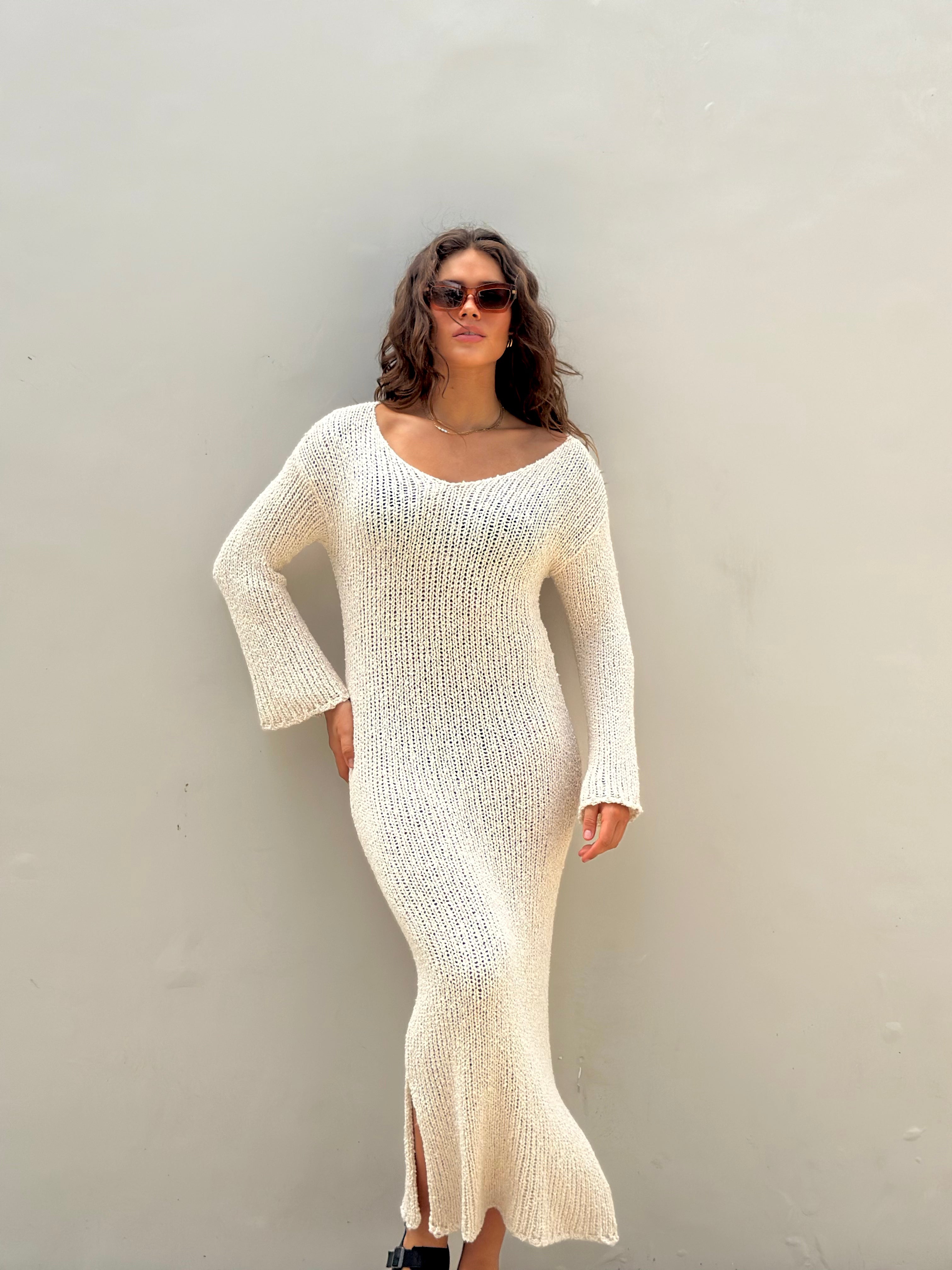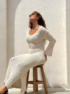 The Beca Honey Butter V Neck Dress is constructed from a cotton-acrylic blend. It features a V-neckline, long sleeves, and a relaxed fit. Designed in a honey butter color, this dress is suitable for various occasions and can be styled in multiple ways.