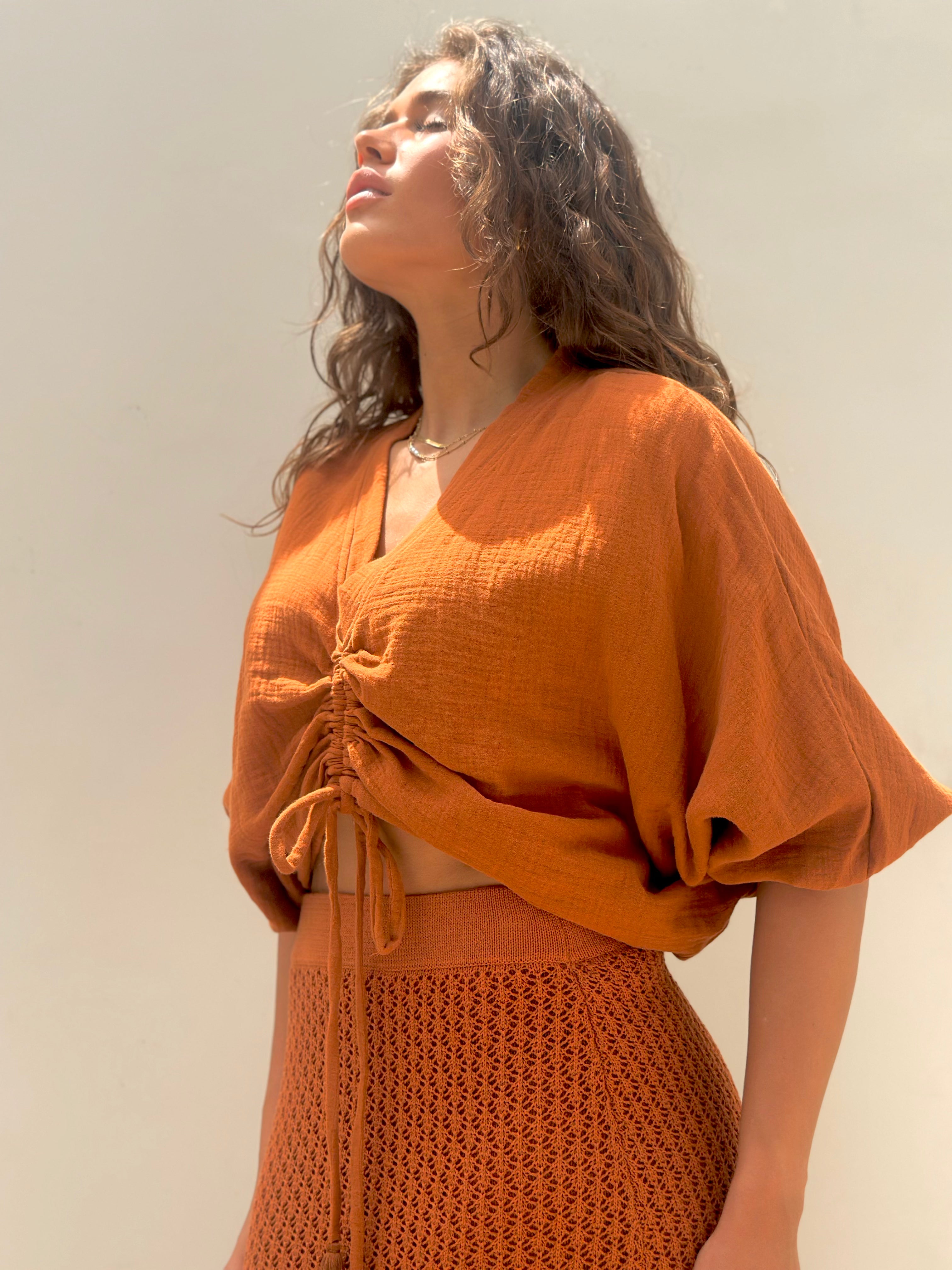 Lightweight texture with effortless style. The Charlotte Gauze Rust Top is crafted from breathable cotton gauze, offering comfort and understated elegance for everyday wear.