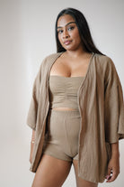 Wrap yourself in effortless elegance with the Aurora Mocha Short Kimono. Crafted from 100% cotton, this lightweight layer offers soft, breathable comfort while adding a touch of sophistication to any outfit. The rich mocha hue brings warmth and versatility, making it easy to style for both casual and elevated looks.