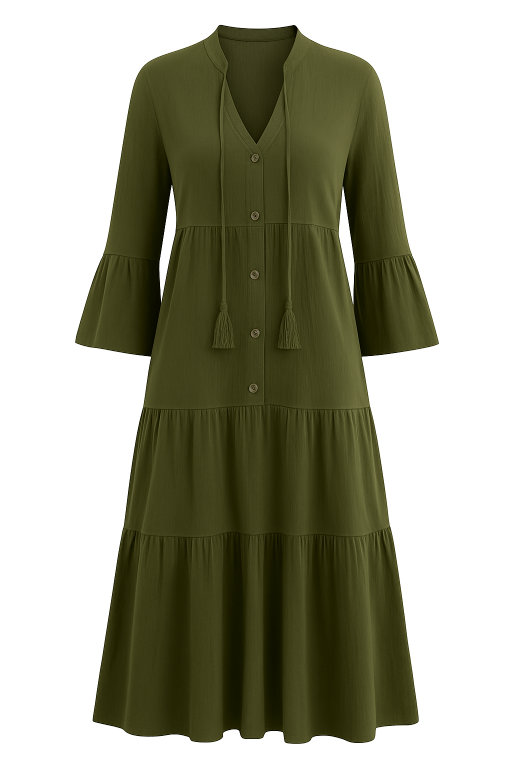 Relaxed elegance with a bohemian spirit. The Gypsy Midi Khaki Dress is crafted from 100% cotton, offering breathable comfort and timeless versatility for everyday wear.