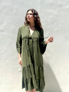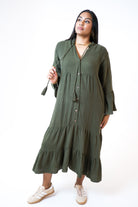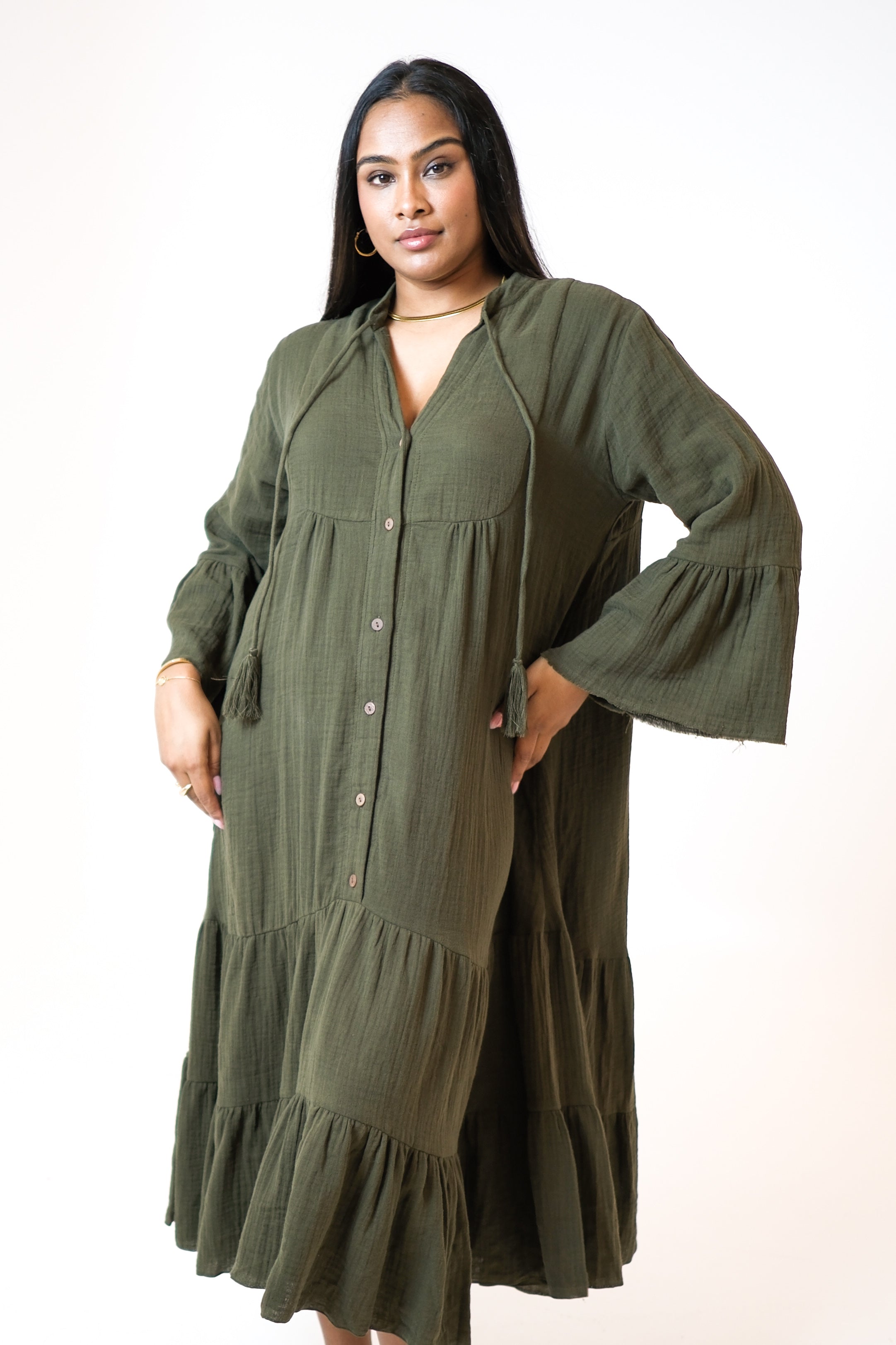 Add the Gypsy Midi Khaki Dress to your wardrobe for a timeless cotton essential that blends bohemian ease with everyday elegance.