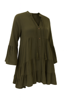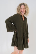 Add the Gypsy Mini Khaki Dress to your wardrobe for a timeless cotton essential that blends bohemian ease with everyday elegance.