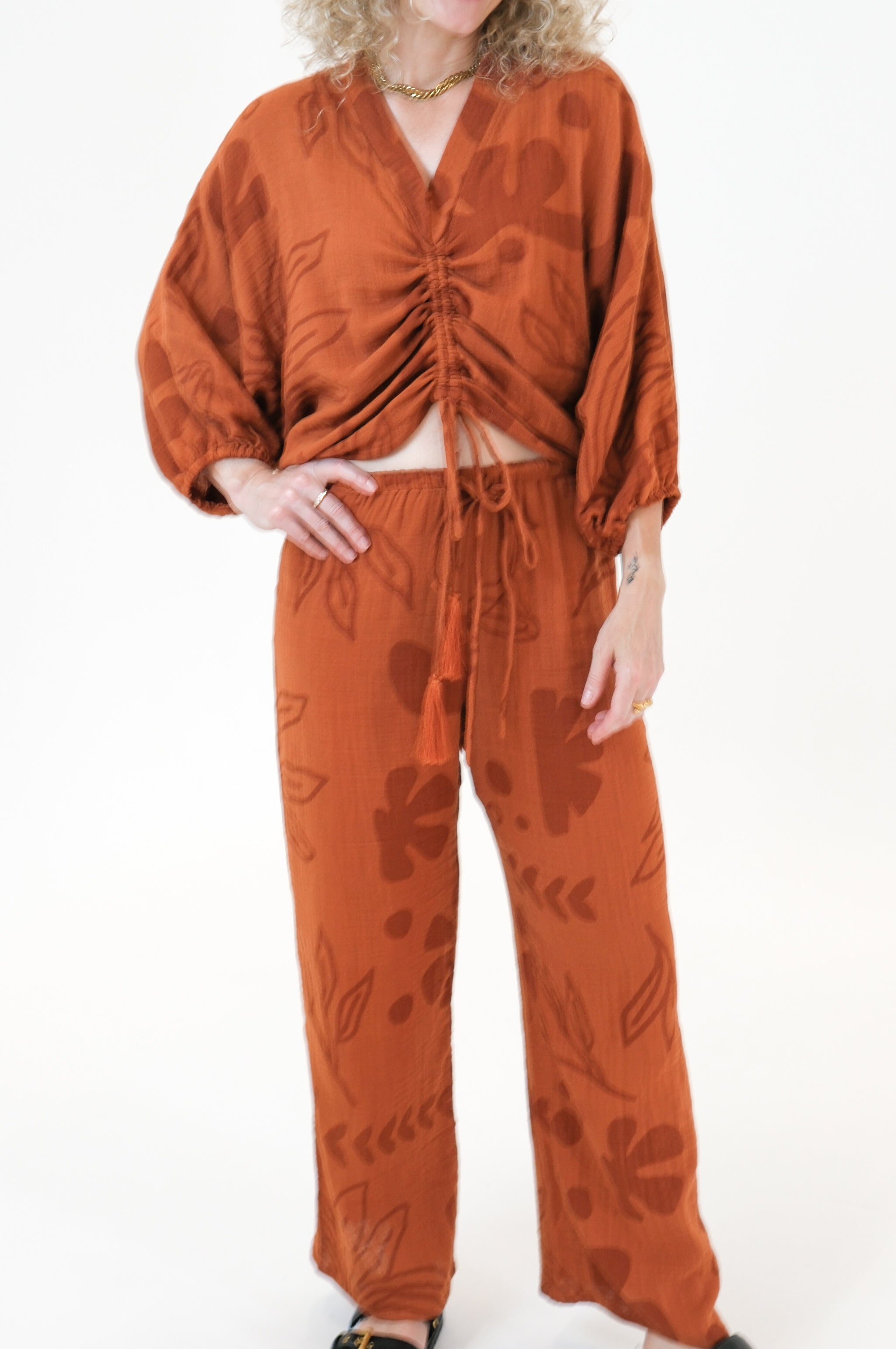 Step into effortless style with the Harper Cotton Rust Print Pant — a stunning blend of comfort and cool. Made from lightweight, breathable 100% cotton, these straight leg pants feature a rich rust hue with subtle tonal prints that give it a modern, artistic edge.