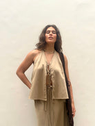 Crafted from a premium blend of lyocell and cotton, the Mila Top offers breathable softness with a lightweight drape that feels smooth against the skin. The tie-front detail cinches the waist for a customizable fit, adding subtle shape while keeping the look effortless and modern.